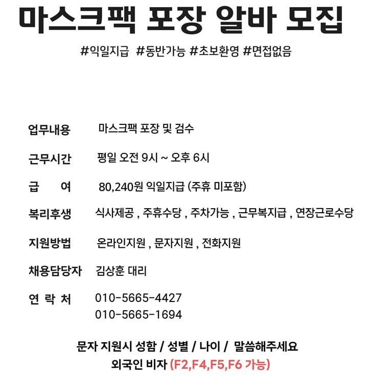 ▶ 식사 제공 / 입식 근무 / 근무복 지급 / 주휴수당 / 주차불가능